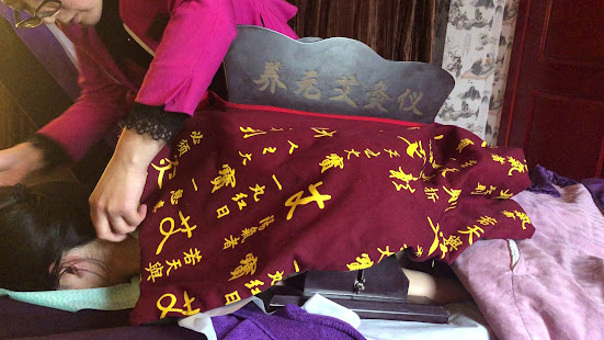 We returned to the massage parlor again to get another round of massages. Xuezhu was feeling some soreness in her traps and back, so she got a special massage. After the massage, they put a special carriage over her back. It held some smoldering logs, which heated up her back. There was a wooden lid covering them, but it could be opened or removed if it gets too hot.